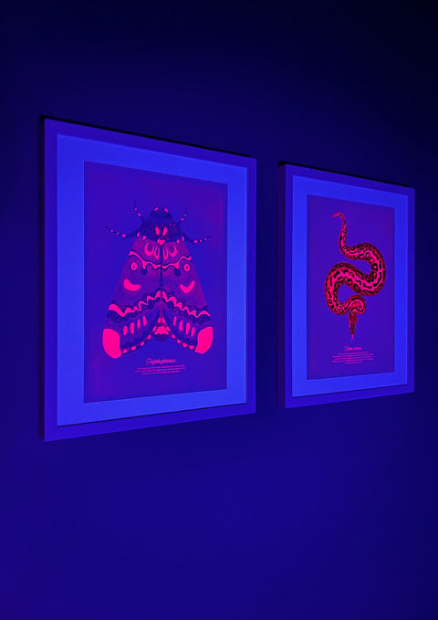 Jeder Kunstdruck der Serie Fluo & Fauna gibt dir die Möglichkeit, eine weitere Ebene zu entdecken. Das Platzieren einer UV-Lichtquelle bringt diese zum Vorschein.